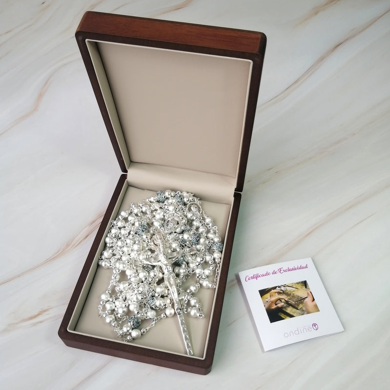 Te presentamos nuestro novedoso estuche elaborado con madera de nogal. En el interior, contiene un forrado en tacto piel color crema que le da un toque elegante y pulcro. Además, contiene nuestro famoso lazo de boda Flower blue, elaborado a base de metal con un baño de plata. Contiene unas cuentas relucientes con diseño floral y pequeños cristales de imitación Swarovski, lo que lo convierte en un complemento redondo. Y, finalmente, contiene su certificado de exclusividad.