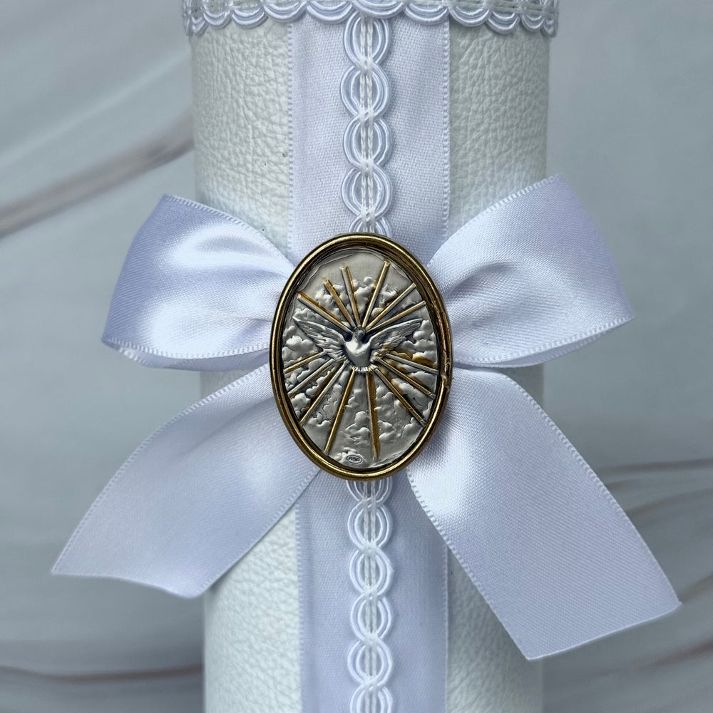 Incluye un cirio forrado en piel genuina blanca, adornado con un moño que en el centro lleva una medallita laminada en plata importada de Italia, con la imagen del Espíritu Santo como símbolo de acompañamiento y guía en la vida de tu hijo.