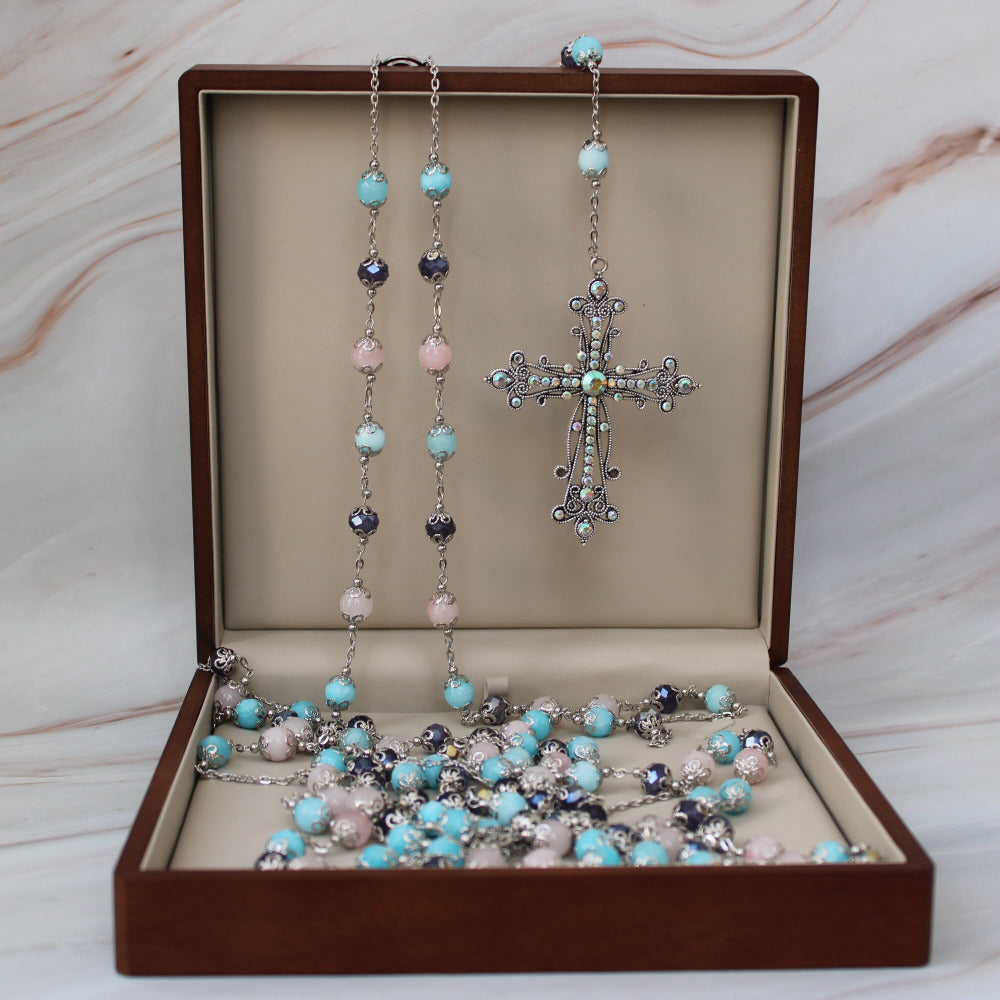 Lazo: aleación de zinc con baño de plata, con chispa 6 mm y acetato facetado en la cruz y cristal, balín metal, casquillos y piedra tipo murano en tonos azules y rosas.