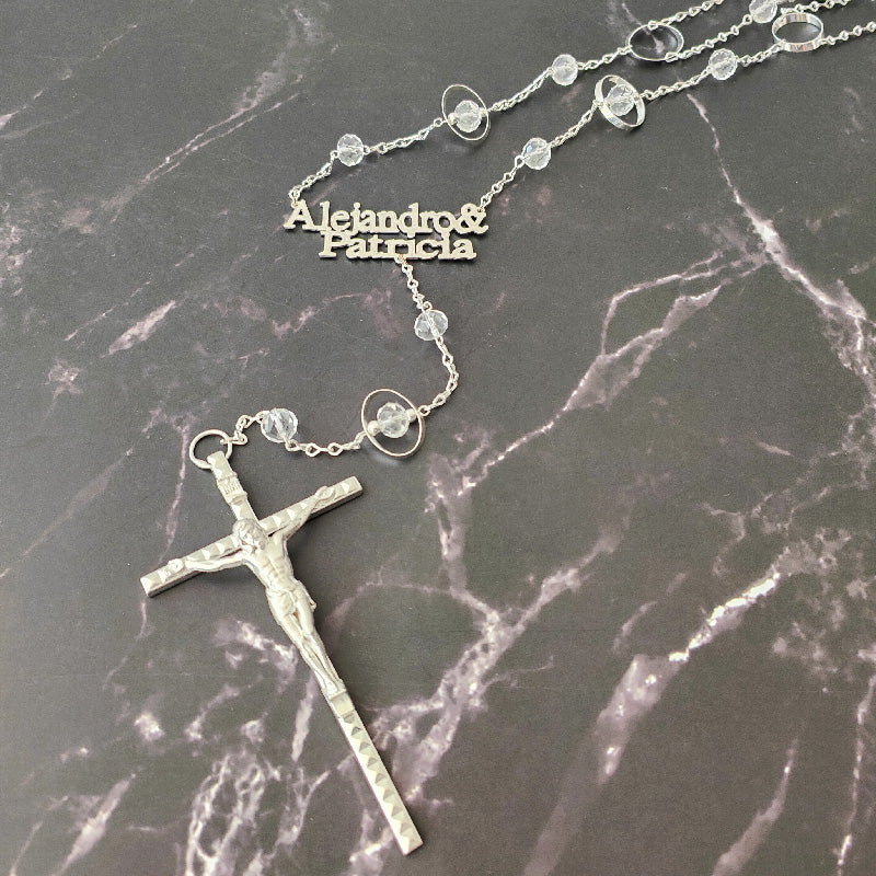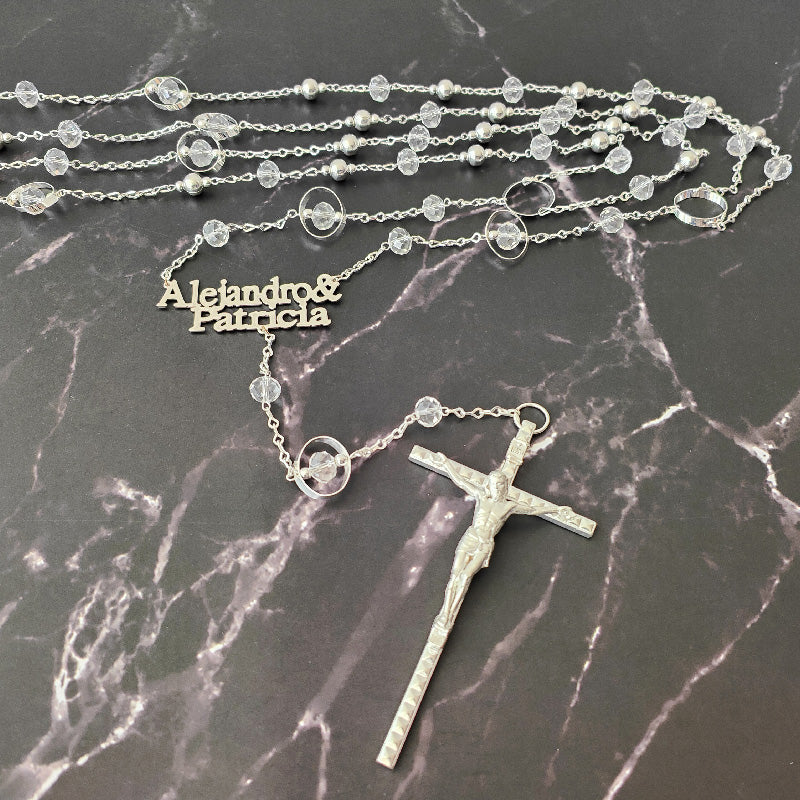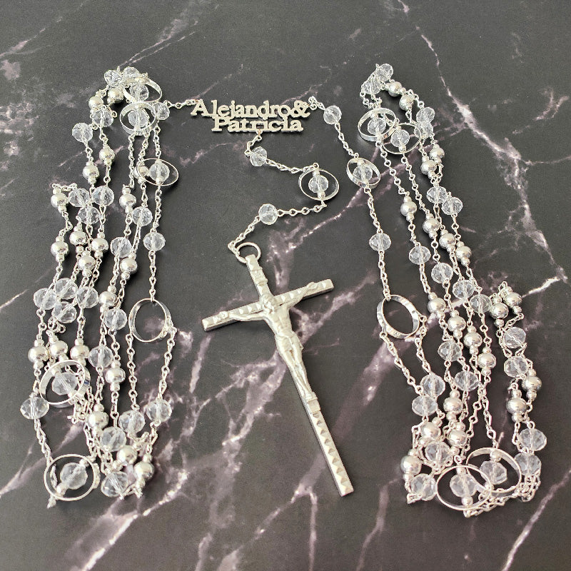 Nuestro lazo viene detallado con finas y relucientes cuentas en color plata y cristal, en diferentes formas (ovaladas, circulares). Con un toque de elegancia, se incluyen 2 nombres (uno del novio y uno de la novia).