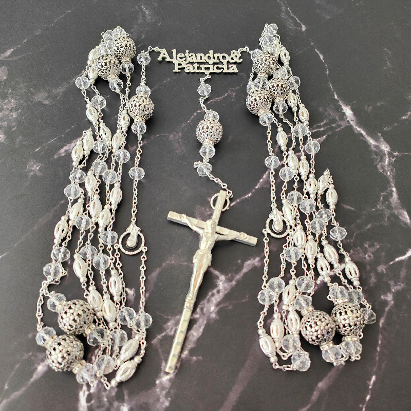 Nuestro lazo tiene un diseño estilo vintage, con hermosas cuentas y detalles en cristal austriaco. Cuenta con certificado de exclusividad, ya que la cruz es importada de Italia. Con un toque de elegancia, se incluyen dos nombres (uno del novio y una de la novia).