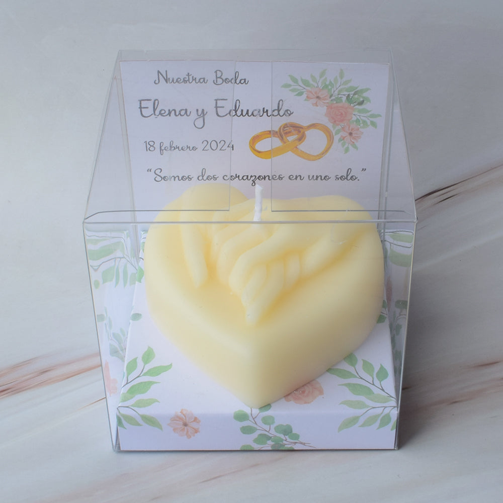 La vela se entrega en cajita de acetato, personalizada con el nombre de los novios y una hermosa frase, junto con un diseño de anillos de boda y flores. La vela es de color beige, con pequeños retoques para resaltar la forma de las manos.