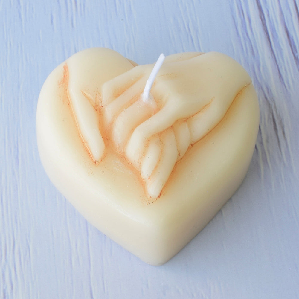 Esta vela es un corazón con dos manos unidas con su anillo de bodas, representando aquel acto tan simbólico en la ceremonia matrimonial donde unen sus vidas.