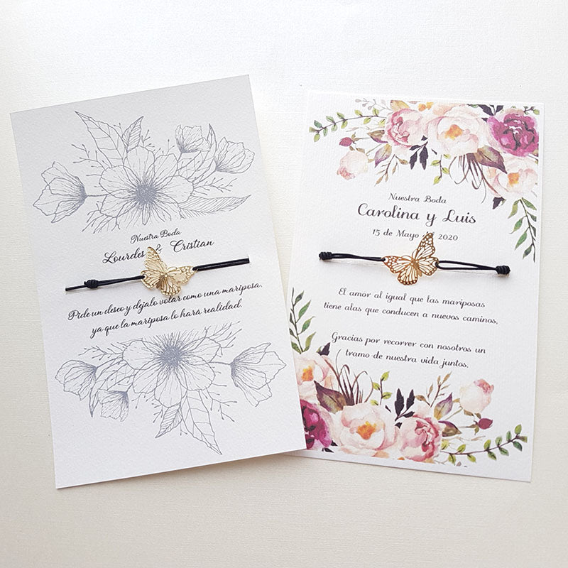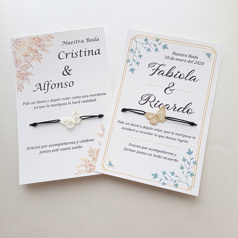 Una bella tarjeta con un corte elegante, donde vienen ilustraciones impresas de estilo floral (hay variedad de colores) junto con el texto: Nuestra Boda, los nombres de la pareja y una adorable frase de Pide un deseo, la cual tiene mucho significado, pues va junto con la linda pulsera que incluye.