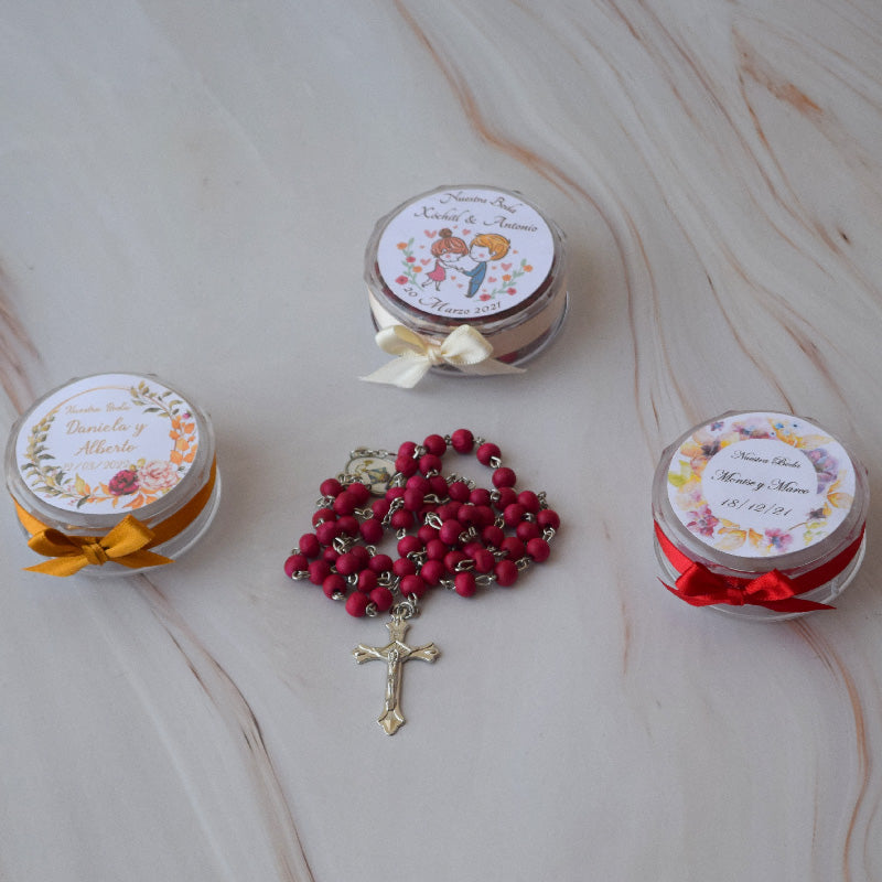 Este hermoso rosario se entrega como recuerdo de tu celebración matrimonial. Personalizado de tal manera que cada uno de los invitados tendrá el suyo, va acompañado de una cajita que lo protege y resguarda. En la caja vienen impresos los agradecimientos por asistir a la boda. Los detalles del rosario son perfectos y además es aromático. Un precioso y clásico recuerdo religioso.