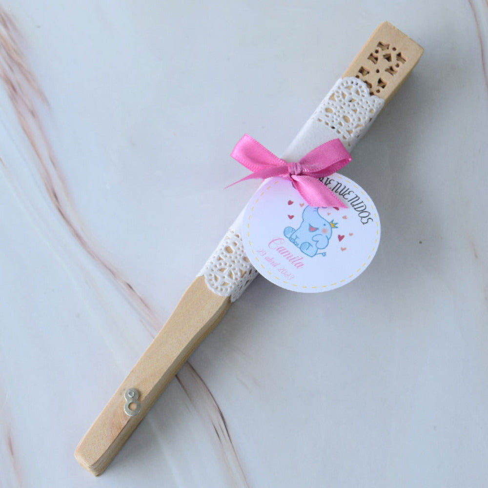 Presentado en un envoltorio de papel blanco decorado, este abanico añade un toque distintivo a su evento. Incluye una etiqueta personalizable con el nombre del festejado y la fecha de la celebración.