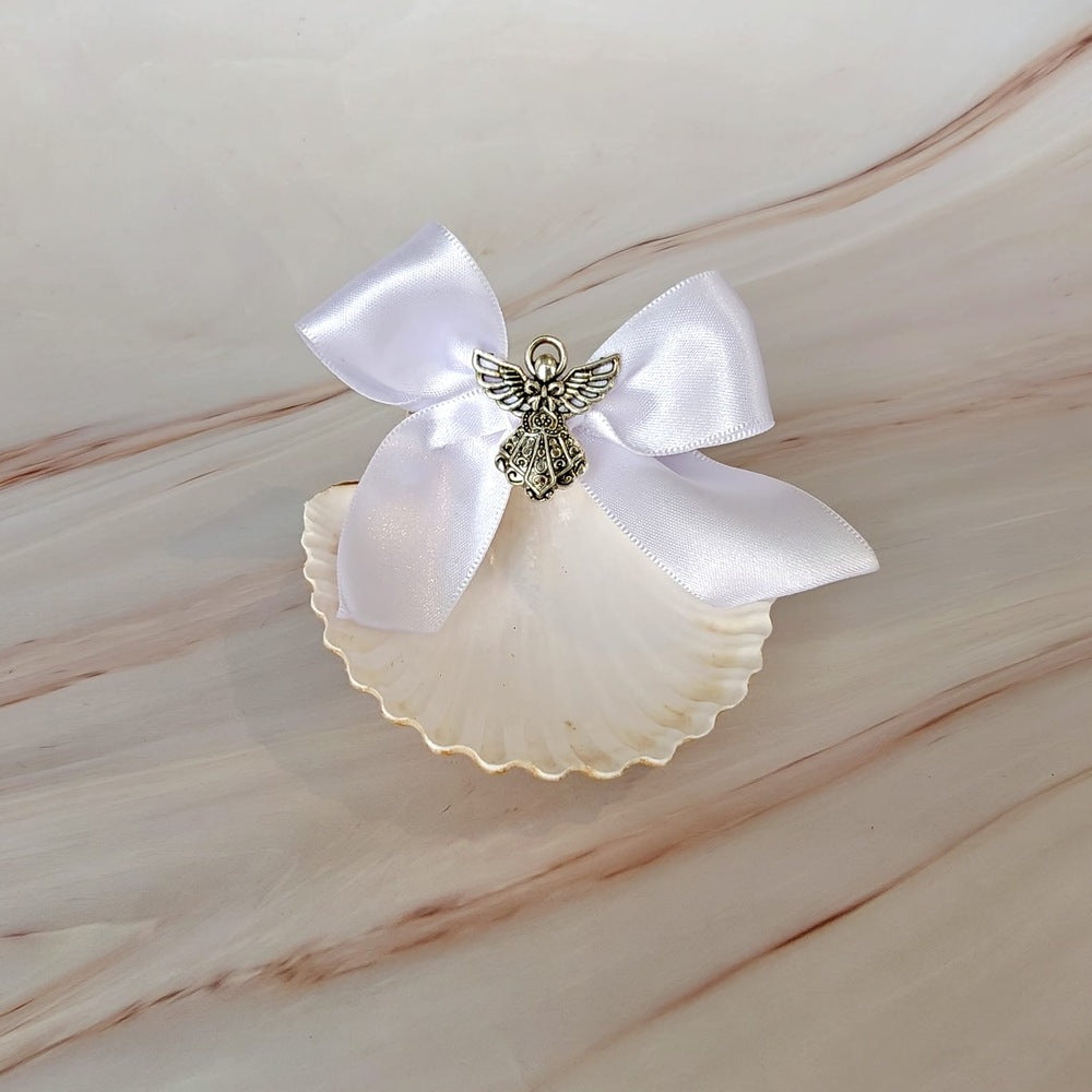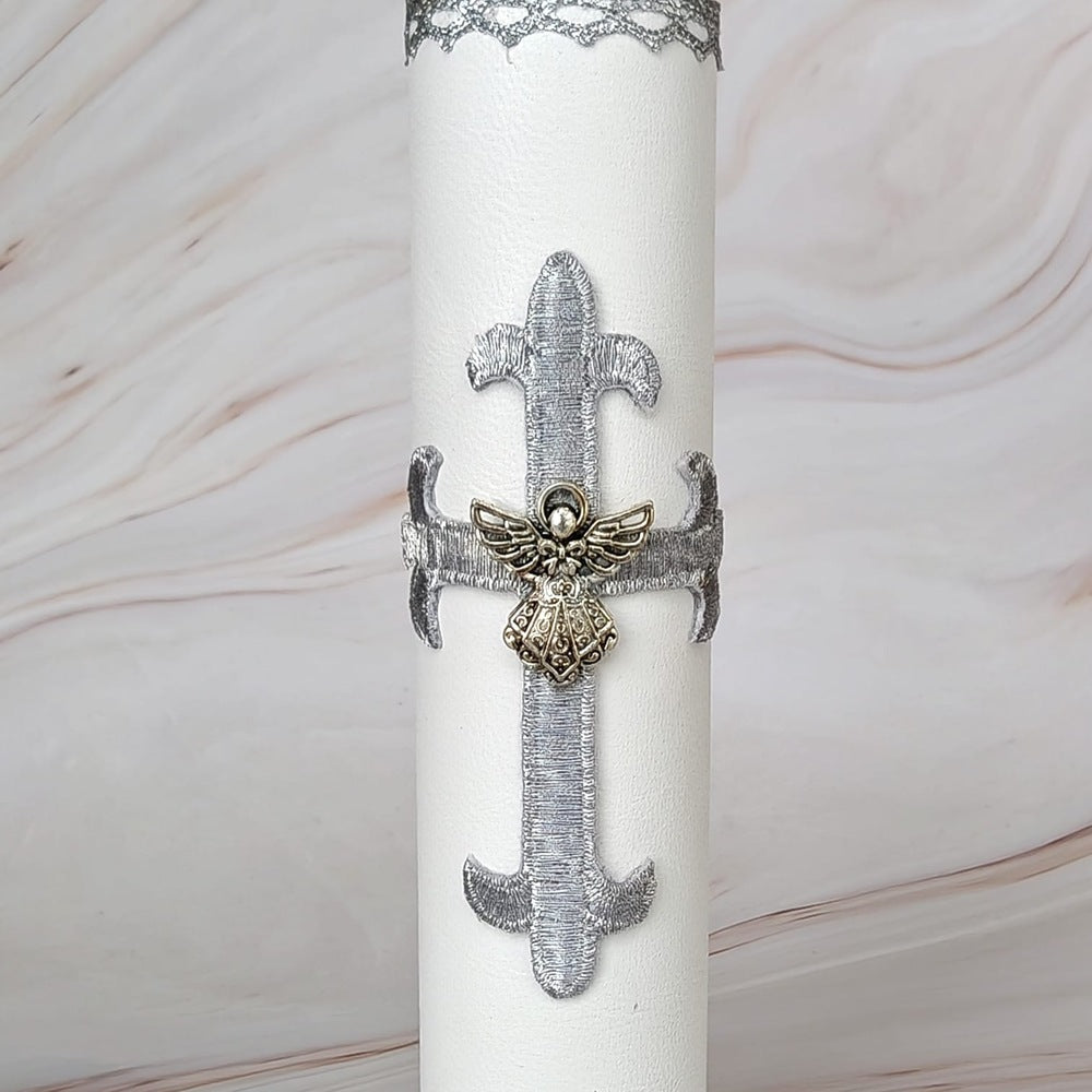 Este kit de bautizo refleja distinción y elegancia. Está compuesto por un cirio forrado en piel de color blanco de la más alta calidad, decorado con una cruz bordada plateada, hecha artesanalmente en nuestro taller. Completa la pieza una aplicación de ángel de metal en el centro; una concha para el agua bendita adornada con un moño blanco hecho a mano y una figura de ángel. Además, cuenta con un paño de tela clara doblado cuidadosamente.