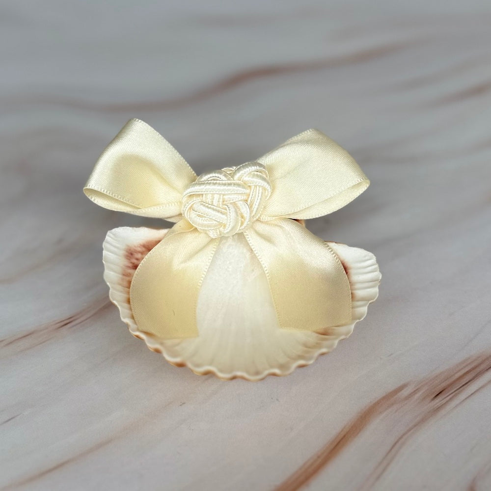 La concha natural está decorada con un moño con un pequeño nudo en el centro, un detalle que armoniza con el cirio y se complementa con el paño 100% algodón en color marfil, creando un conjunto artesanal lleno de ternura que quedará en la memoria de los padres para siempre.