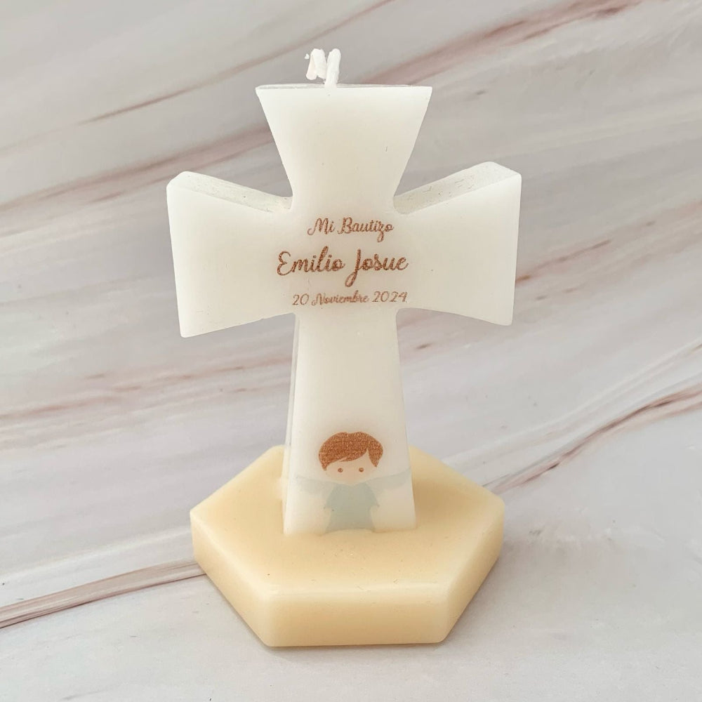 Hermosa vela en forma de cruz, elaborada artesanalmente, ideal como recuerdo de bautizo. Personalizada con el nombre del bebé y la fecha del evento, incluye una tierna ilustración de un angelito que simboliza la pureza y protección. Su base hexagonal le da un toque delicado y elegante, convirtiéndola en un detalle inolvidable para compartir con familiares y amigos en este día tan especial.