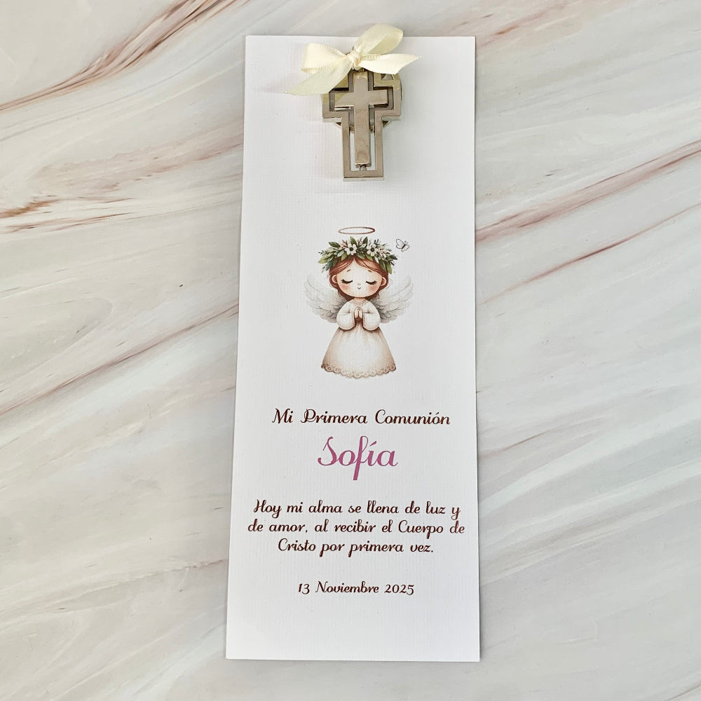 Buscas un hermoso recuerdo para la Primera Comunión de tu pequeña. Tenemos para ti esta tarjeta. Tu hermosa luz. Esta tarjeta tiene el nombre del evento, el nombre de la pequeña, la fecha y una pequeña frase con una impresión de unas niñas rezando, a juego con un llavero de cruz en color plateado.