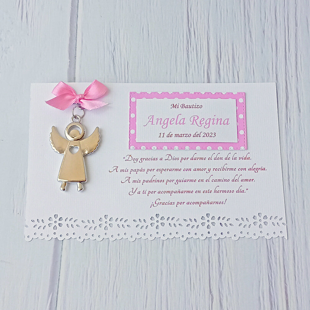 En la parte superior, un recuadro rosita con puntitos blancos adorna la etiqueta en la que viene el nombre de la festejada y la fecha. A un lado se encuentra un precioso y adorable llavero de angelita que, dependiendo de la disponibilidad, se puede escoger entre un moderno y elegante llavero de ángel color plateado con un pequeño corazón en su centro o bien una tierna angelita en color rosa.